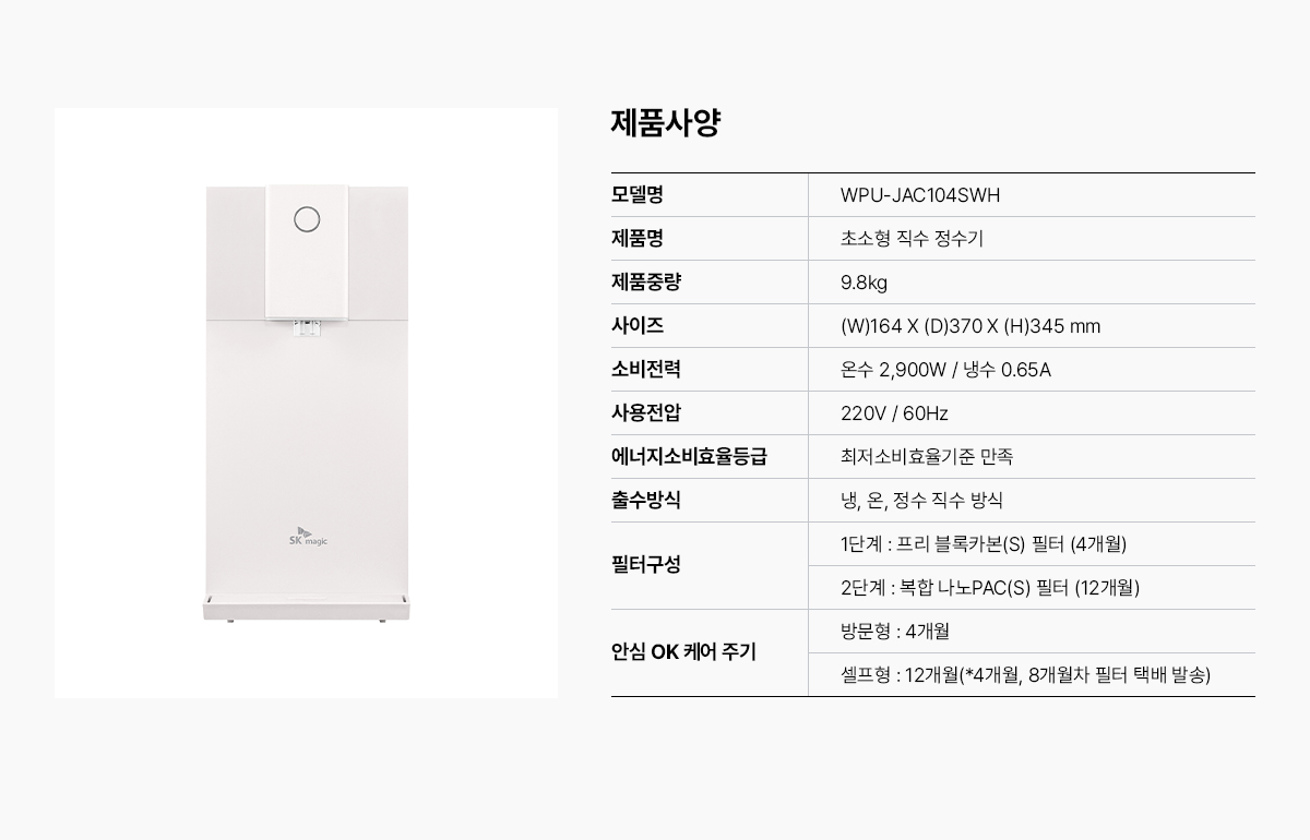 | 모델명 | WPU-JAC104 | 상품명 | 초소형 직수 정수기 (냉온정) |